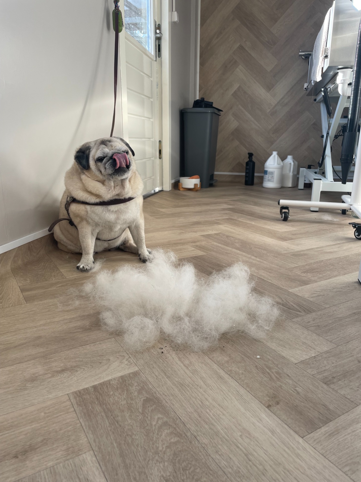 Je verwacht het misschien niet maar na het drogen van deze mopshond had ze nog steeds genoeg haar! Naast dat dit een hele opluchting is voor uw hond is dit ook een opluchting voor u. Het scheelt toch erg veel met de schoonmaak!